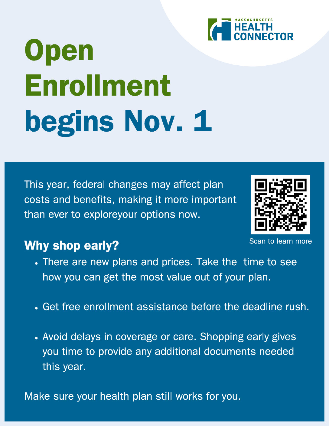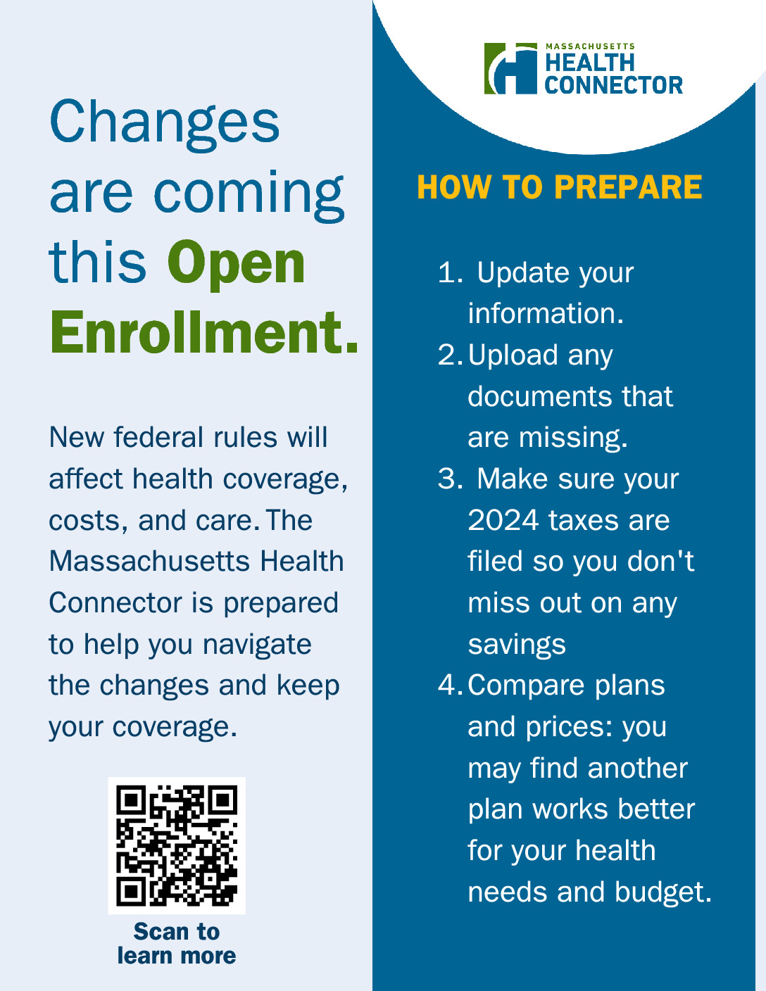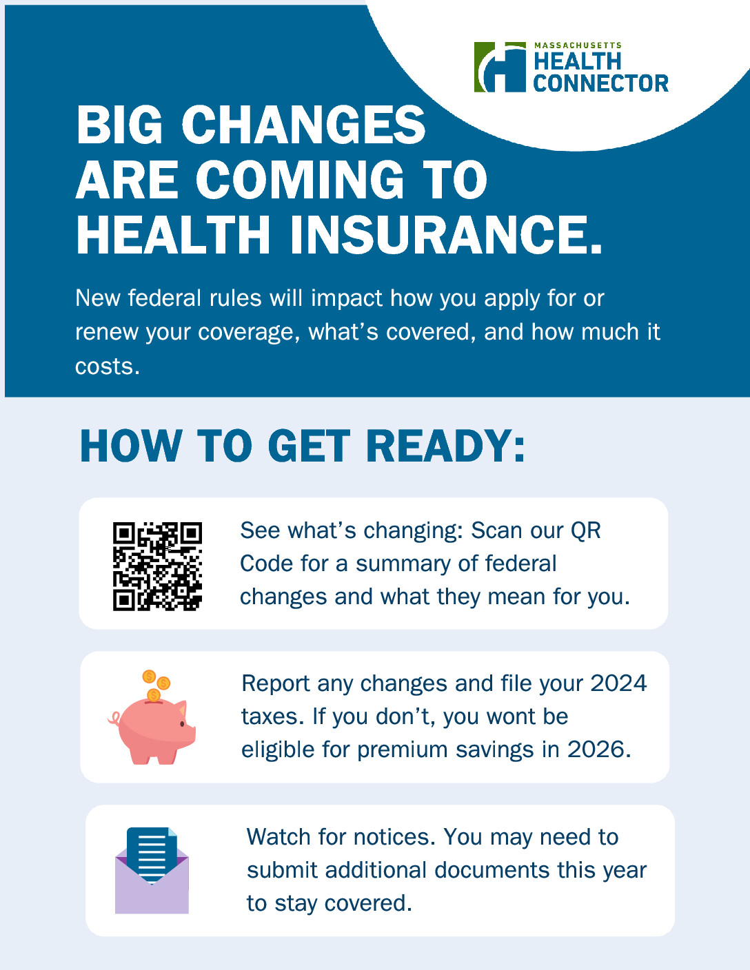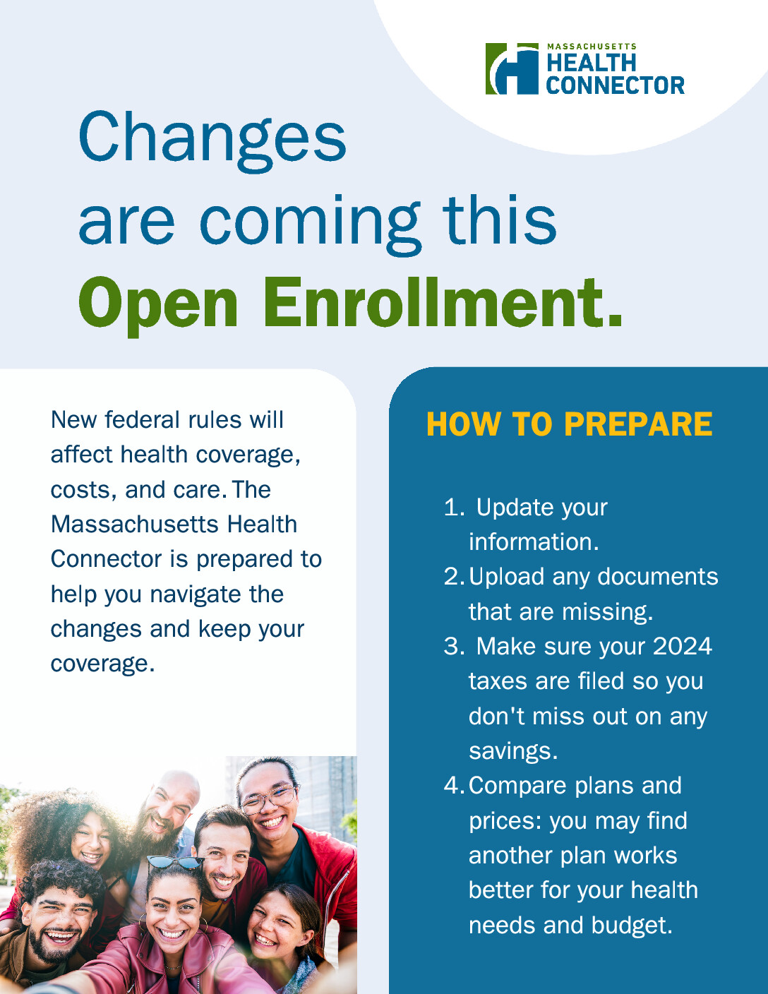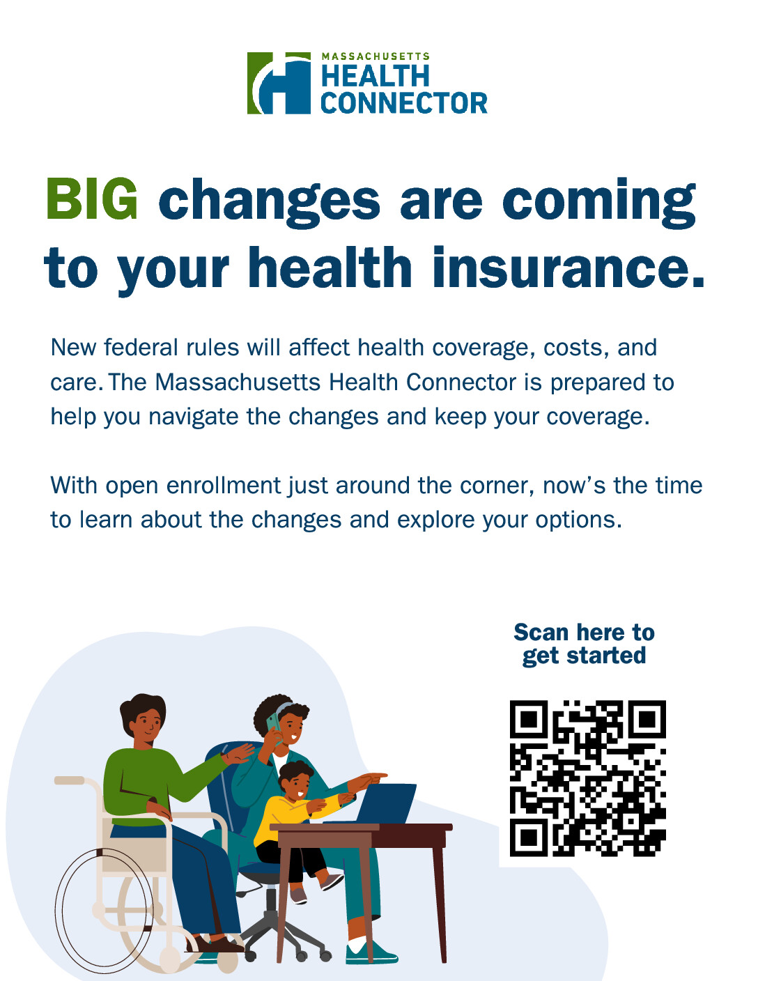 New federal rules will affect health coverage, costs, and care. The Massachusetts Health Connector is prepared to help residents navigate the changes and maintain their coverage. With open enrollment just around the corner, now’s the time to learn about the changes and explore your options. Visit https://www.mahealthconnector.org/updates.